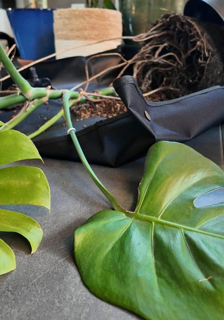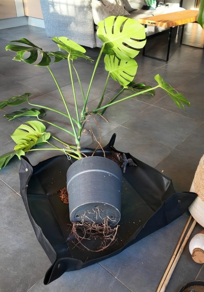 Placez votre Monstera dans le tapis de rempotage et enlevez délicatement son pot.
