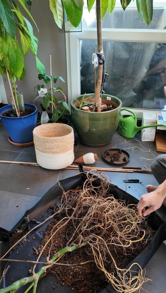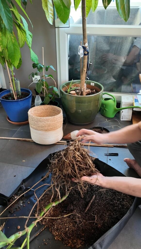 Ce n’est pas la partie la plus agréable, mais elle est indispensable pour que la plante reprenne une croissance soutenue dans les meilleures des conditions. Retirez la terre des racines et démélez-les soigneusement en commençant par le bout des racines et en remontant avec patience jusqu’à la base de la plante