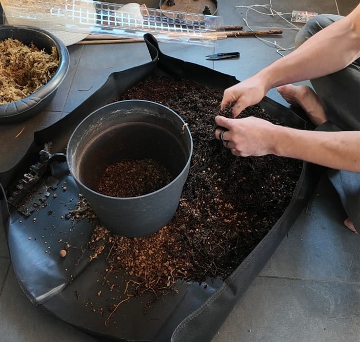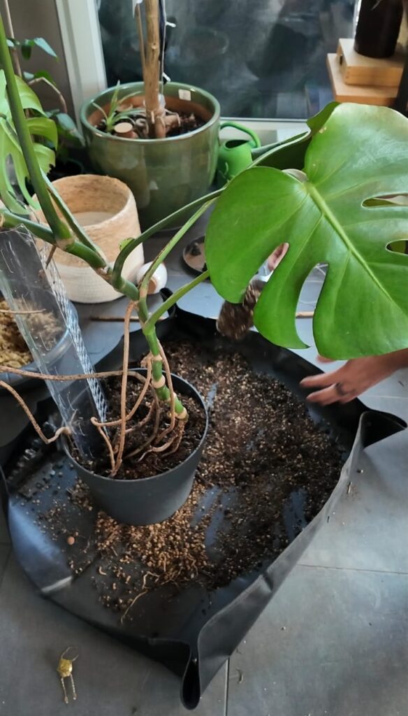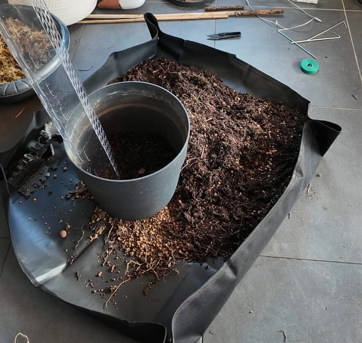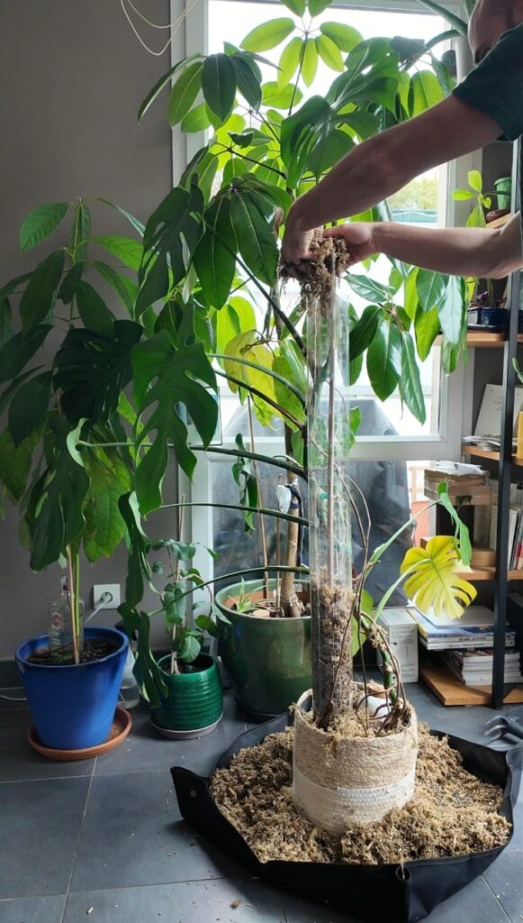 A présent, mélangez la sphaigne avec du terreau dans votre tapis de rempotage. Récupérez le pot (changez le pour un plus grand si les racines de votre Monstera étaient à l’étroit) et installez votre support de plantes grimpantes.