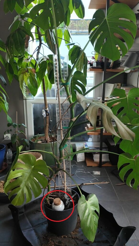 Fixez votre Monstera à son support de plantes grimpantes pour qu’elle en profite pleinement. Libérez-vous aussi de la contrainte de l’arrosage en plaçant une Oya (ou Olla) : ce petit récipient poreux en terre cuite que vous remplissez d’eau va permettre à la plante d’aller chercher l’humidité dont elle a besoin, sans excès. Vérifiez au moins une fois par semaine qu’il y a toujours de l’eau dans l’oya.
